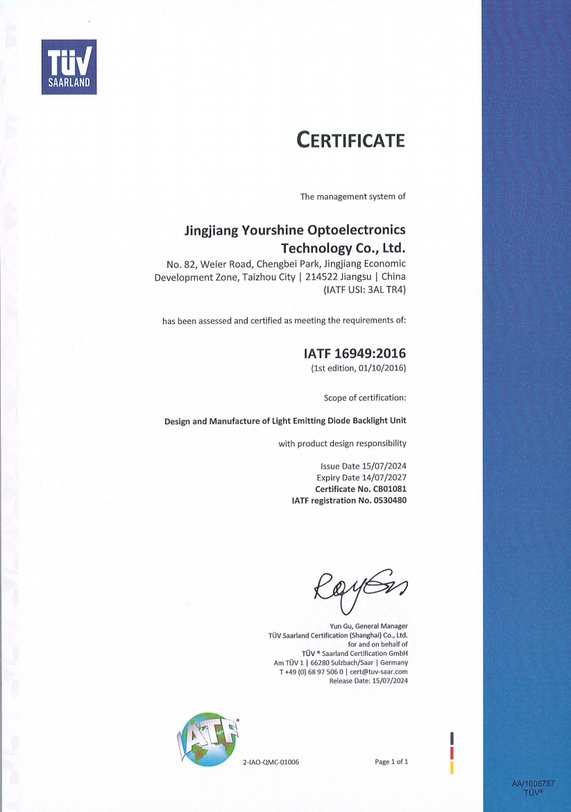more永盛光電依托科技,強(qiáng)化管理,建立了完善的體系管理,分別通過(guò)了ISO9001、ISO14001、IATF 16949國(guó)際質(zhì)量體系認(rèn)證,為公司的長(zhǎng)足發(fā)展奠定了堅(jiān)實(shí)的基礎(chǔ)。